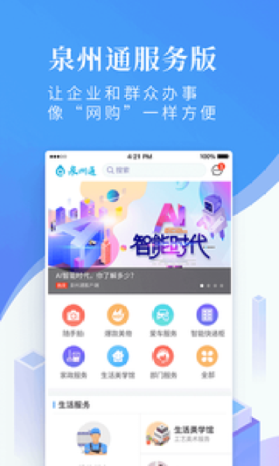 泉州通服务版,主流新媒体,移动新门户。泉州通服务版是泉州市委市政府重点扶持、泉州晚报社全力打造的泉州智慧城市移动应用平台,主打“新闻资讯+政务发布+生活服务”三大功能板块,致力打造泉州最权威快捷的移动新闻资讯门户、掌上政务大厅入口、本地移动生活服务互动平台。