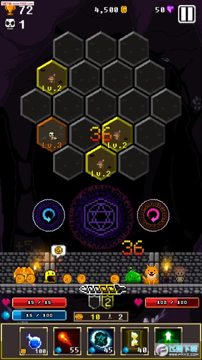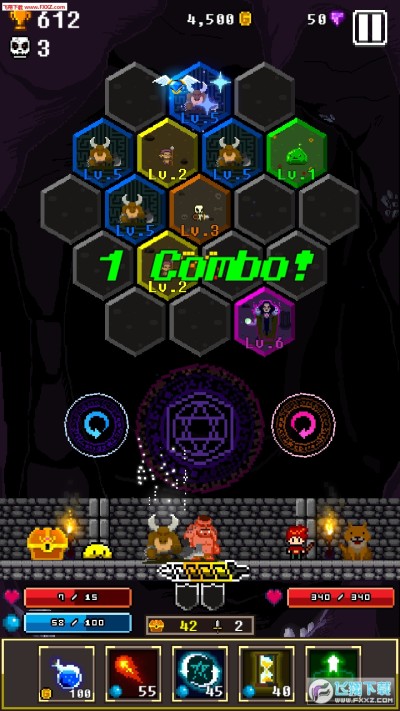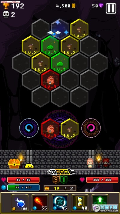 暗黑的像素风还蛮喜欢的,当中涉及到的角色有一些是我们比较熟悉的,游戏核心玩法其实就是合成消消,在一个六边形的空间中,不断的进行合成升级打怪,玩家放置的速度要快慢而且还要有策略,不要当整个六边形空间沾满的时候,还没有三个相同的,进行合成消消,这个时候你就失败了,随着地牢的不断深入,怪物的不同类型,组合的方式和展现的空间都会有变化,整体变化还蛮多的一款益智休闲游戏。