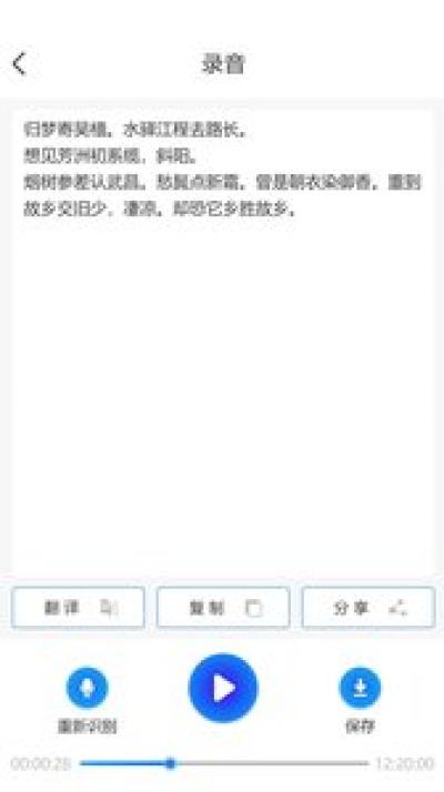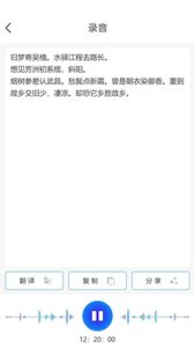 提供保存录音音频、识别文本、翻译文本为音频文档,办公文档功能,可分享文档至微信、 QQ等社交软件,支持文档管理,分享功能。