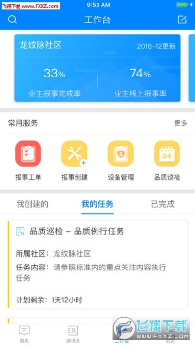 在工作台可以查看任务进展,任务类型:绑定申请、保姆、智能硬件报事、报事报修、巡检;方便管家及时高效的处理业务,从而提升了业主的服务满意度。