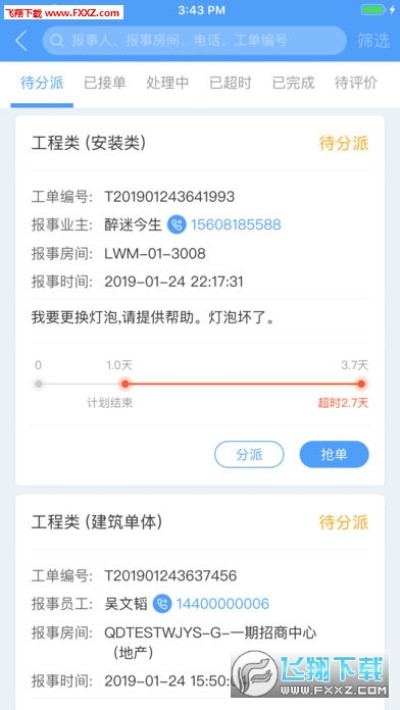 如电梯工单、设备工单、品质巡检等服务随时创建,管理人员随时随地服务业主;