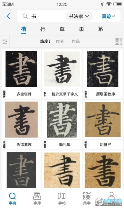 1、查询单字:列出单字在各书法家在各字帖中的写法。