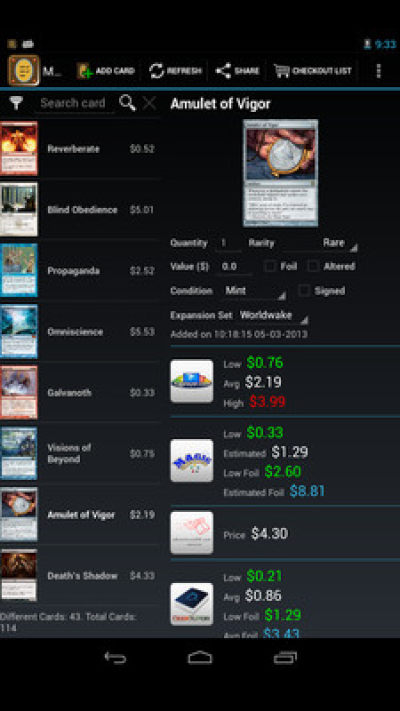 魔法风云会愿望单让您能够迅速方便的保存您想要的卡牌,并显示图片、各个知名网站的现时价格(使用您所在位置的货币)、可取得的延伸系列、卡片名称等让您能更方便的收集和交易卡牌的信息