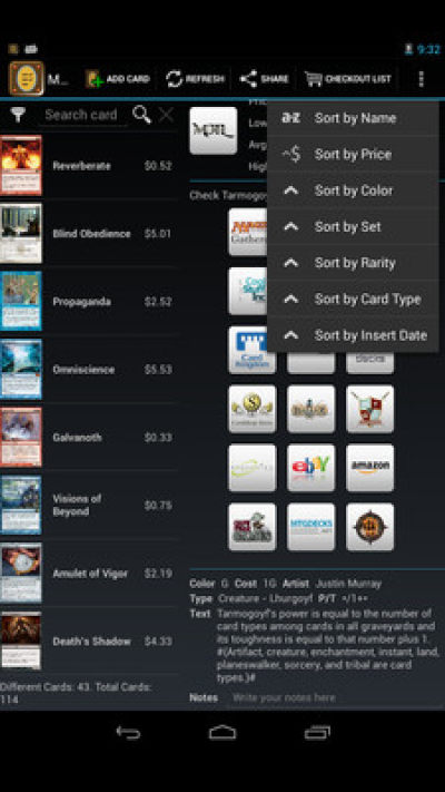 MTG Wishlist允许您在Wishlist中快速保存您想要的魔术收集卡,直接在您的设备上显示图片、著名网店的实时价格、卡文本、可用的扩展集和更有用的数据。MTG愿望列表包含一个完整的卡片数据库,当插入卡片时可以自动完成,或者有机会检查每张卡的可用扩展集。耐心等待初始加载,有20000多张卡要加载!MTG愿望列表直接从以下网店显示魔术单身的卡片价格,并使其离线可