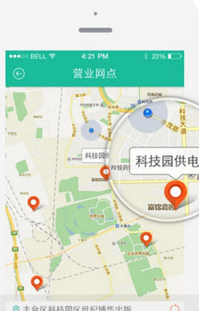 5.网点导航:可进行周边搜索和定制搜索。周边搜索时,通过GPS获取客户位置信息,搜索周边营业网点;定制搜索时,输入关键字,进行营业网点的搜索。