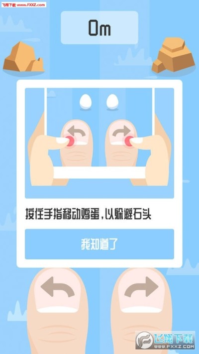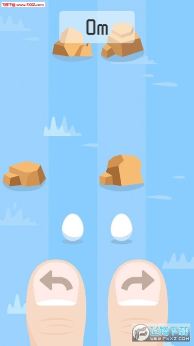 用双手大拇指按住屏幕下方的两个手指移动鸡蛋,以躲避石头,通过松开和按住手指来控制蛋蛋。