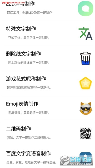 头像添加认证图标制作、放屁声模拟器、LED弹幕制作、还有有趣的聊天小表情、制作游戏花式昵称、二维码一键制作、文字转语音制作。