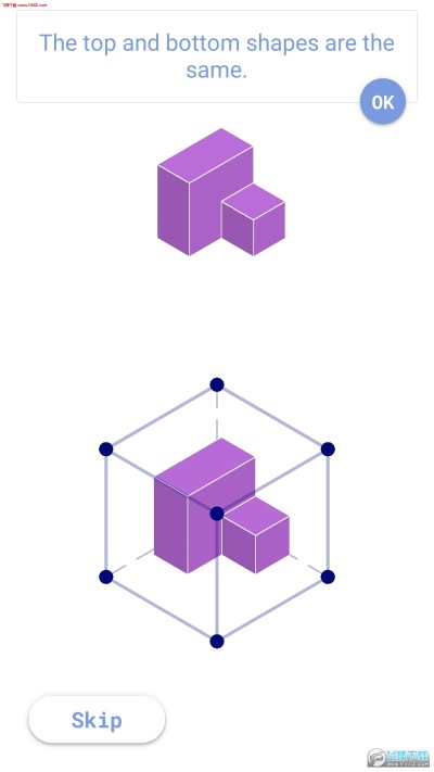 3、玩法简单,每个关卡里有二种不同形状的立方体,玩家需要点击屏幕下方的立方体,改变它的视觉形状,让它和上方的一致才能够成功过关;