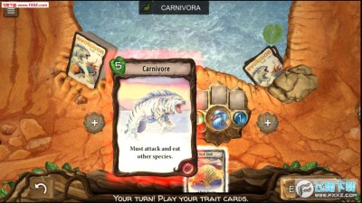 2、玩法上游戏采用卡牌对战的模式,玩家需要控制自己的远古生物,通过从对手手里抢夺各种食物,让它们不断地进化,最终取得对战的胜利;