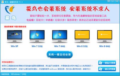 菜鸟一键系统重装是一款集合了下载、智能安装重装为一体的免费软件,菜鸟一键系统重装让你不用u盘、光盘也可以非常方便快捷的一键装系统,即使你是不会装系统的菜鸟,也能让你轻轻松松学会装系统,让你安装系统不再求人。