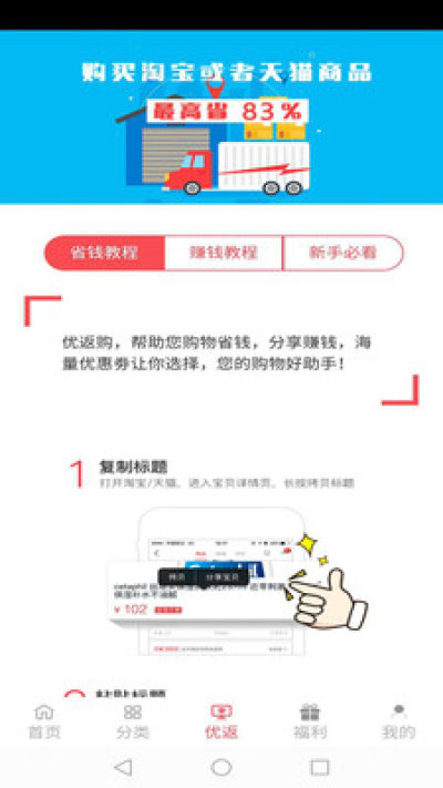 省钱好帮手,省出零花钱。 新模式,为大量用户节约钱。 分享赚,优惠多多。 我们把产品、服务的价格定在一个返利高的水平上。大量福利优惠券尽在优返购。