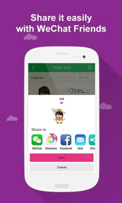 5.分享MojiMe到WeChat、WeChat 朋友圈或是Facebook,让全世界都看到你自己的动态贴图 !