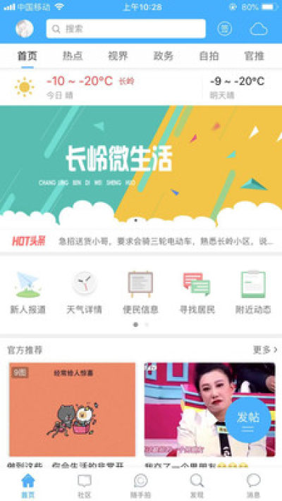 2、社区圈子:小城映像,情感驿站,时尚秀场,吃喝玩乐,征婚交友,旅游生活,日常百科等兴趣类社区集合,用户通过兴趣交流,结交本地志同道合的朋友。