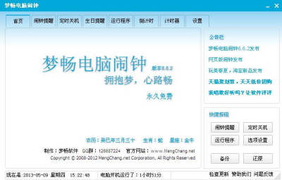 梦畅电脑闹钟是一款完全免费的多功能定时执行计划的软件,电脑可以充当一个闹钟,用户也可以定制提醒内容,在预定的时间提醒用户该办什么事,软件还提供了定时关机、更换背景功能,可以设定三个时间点让闹钟响。