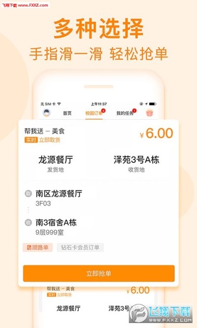 只要你是在校大学生,都可以注册成为校园飞人,为你的校友提供买,送,取,帮,办等跑腿服务。