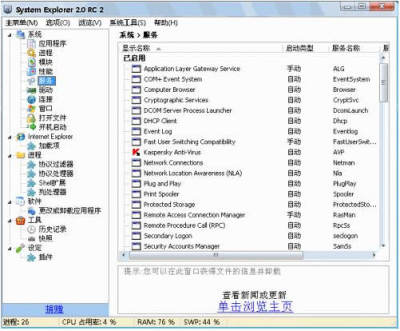 这是一款全功能的系统分析工具,它可以在第一时间让你掌握系统正在运行的任务。从当前进程到已经安装的驱动程序,包括网络连接,系统启动运行程序,IE插件等等,基本上只要想到的,都可以在里面找到相关位置