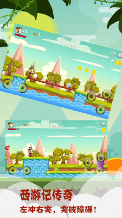 西游记传奇是一款有趣好玩的休闲单机手机游戏。在游戏中玩家需要控制悟空或者猪八戒角色,躲过各种障碍,穿越各种困难,达到终点,游戏中,每个角色有3滴血,如果操作不当减血,那么玩家共有3次机会可以减血。