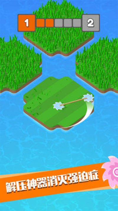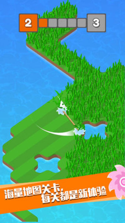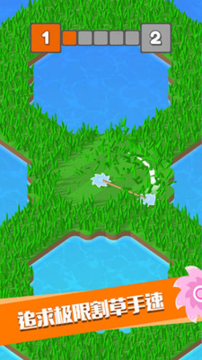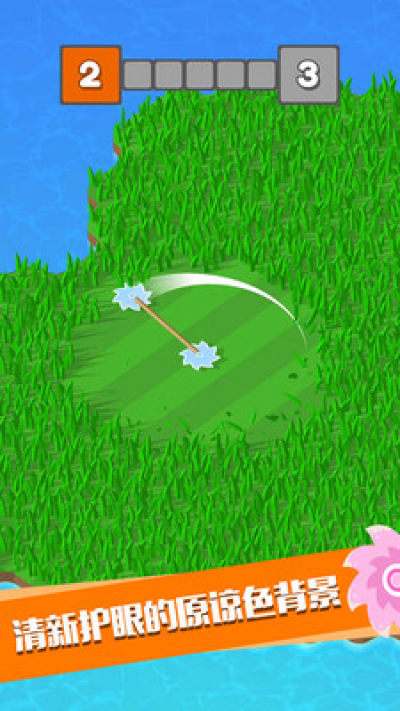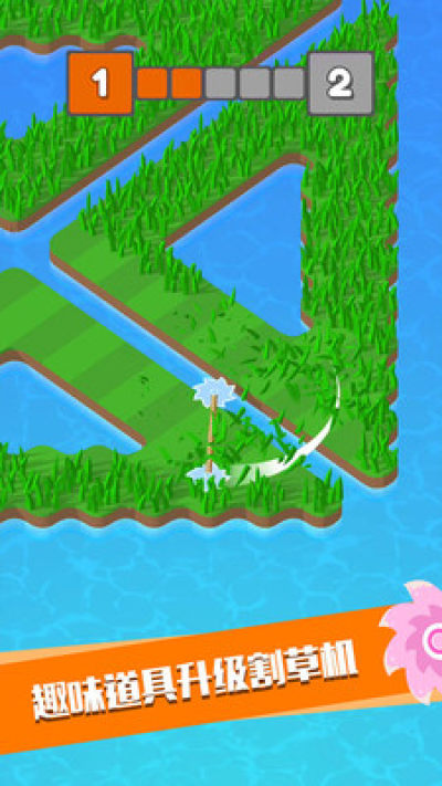 割草机镰刀会自动旋转割草,点击屏幕即可更换割草机的旋转方向,交换固定点,从而移动割草机位置,探索更远的区域。镰刀经过的地方会自动消除小草,把关卡里所有的地面都消除掉即可通关。