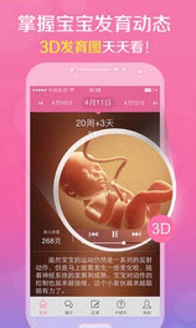 2.胎宝宝变化:通过3D动画演示,了解胎儿从受孕到诞生的全过程,告诉你胎宝宝每一日的变化;