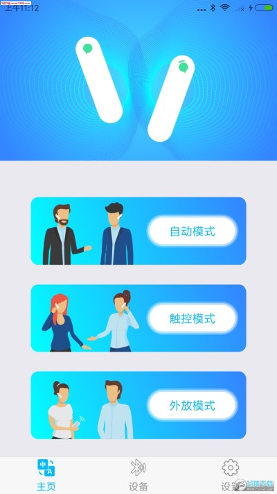 取出两只耳机,蓝牙连接上手机App,分享一只耳机给朋友,自己戴上一只。App主页上选择当前模式,设定好各自语言,立即开始翻译语音交流。