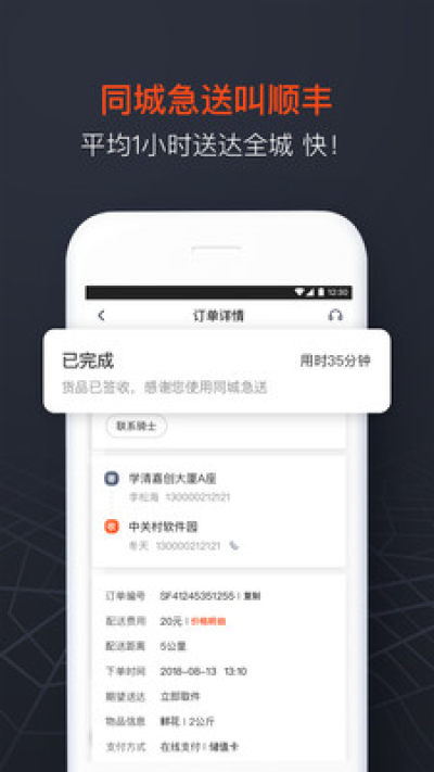 凭借顺丰多年积累的快递行业经验,结合高效的同城配送智能调度系统,即时响应,准时送达。