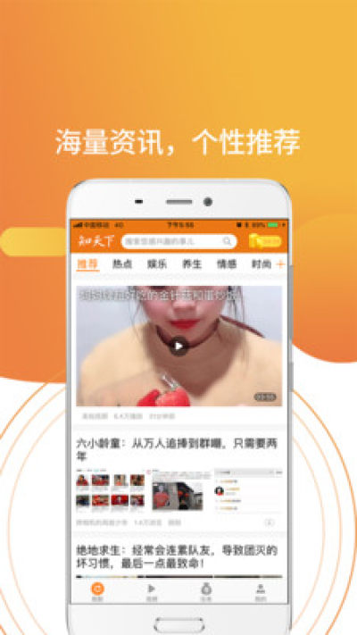 知天下为每位用户标配贴心大数据机器管家,24小时辅助您筛选优质,感兴趣的个性化内容并进行推荐。从此不出户知天下新鲜事,在这里娱乐新闻、健康养生、生活情感、头条热点、猎奇故事,搞笑段子、心灵鸡汤等应有尽有,一网打尽。