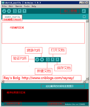 上图对Arduino主界面进行了简单的功能标注说明,在后面的章节中将详细说明每个菜单的功能用途。