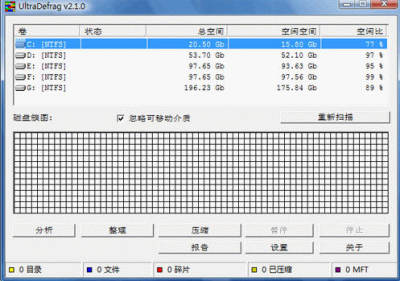 UltraDefrag Portable是一款功能强大的免费磁盘开源工具,适用于nt内核的windows。该软件速度超快,设计简约,没有皮肤,没有本地化设置,没有动画。虽然很小却很强大。