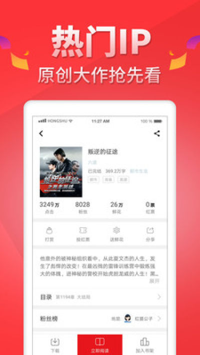 红薯阅读是红薯中文网开发的一款Android平台海量精品图书和强大阅读功能的手机软件,集当前最火的网络小说书库、本地小说阅读功能于一体,秉承红薯小说网”看书,交友,轻松生活”的宗旨,旨在为读者创造完美的小说阅读体验。