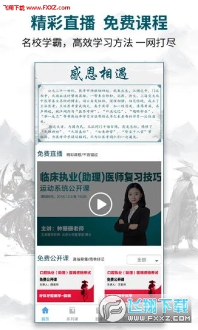 本应用包含免费在线直播、录播课程,免费题库,资讯等功能,帮助各位在医考路上的同仁们更加方便的进行学习。