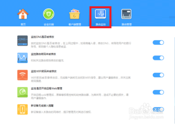 在“路由监控”选项卡中,可以对无线路由器的各项安全参数进行分析,同时也提供安全防护功能。