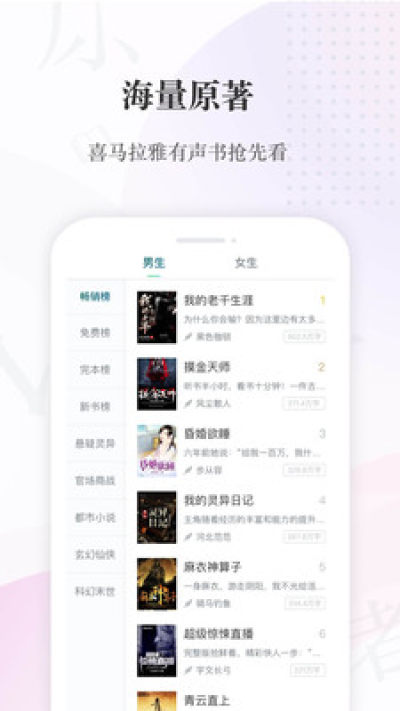 喜马拉雅阅读app提供海量的同名原著小说阅读,包含了丰富的小说类别,总能找到你喜欢的那一款,不仅可以作为一名读者,用户还可以做为一名作者开启写作模式哦,收益多,福利高,看书写书一个喜马拉雅阅读app 就能搞定。