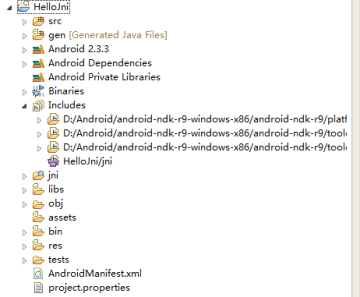 在这种情况下,就可以编写一般的代码的程序啦!但是,这样写的C代码是没有代码的提示。点击在你的工程Project选择Android Tools,Adding Native Support 便可导入一些C的头文件库。如下图