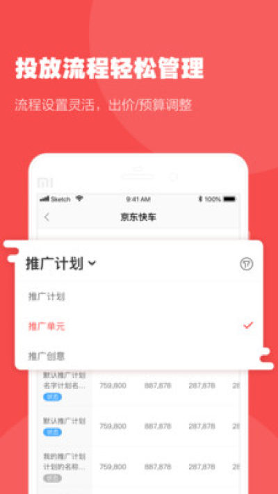 2.推广管理:您在京东快车下创建的计划/单元/创意/关键词,APP上也同样可以对其进行相关推广管理操作(修改名称/预算/出价、启动/暂停等),电脑不在身边,一样可以让您随心所欲!