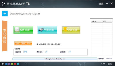 包括全盘杀毒,快速杀毒。天威优化助手目前支持全盘查杀.路径查杀.和快速查杀,自动生成杀毒记录。功能很稳定,同时可以预测杀毒时间。