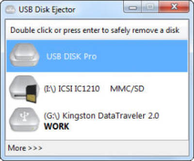 我们还是由最简单的说起。运行 USB Disk Ejector 后,当你插入 U 盘或者 USB 设备的话,USB Disk Ejector 会识别出来,并且显示在它的小界面上。当你需要推出它们的时候,只需要双击目标或者在目标设备上按一下回车就可以了。