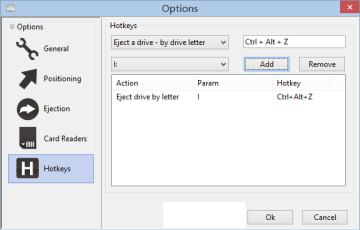 而在「Hotkeys」里就可以为 USB 设备的快速推出设置快捷键了。如果你的分区比较固定的话,比较适合使用「by drive letter」这个按照盘符来识别的方式,再在下方设置指定的盘符,右侧设置好快捷键,点击「Add」添加就可以了。