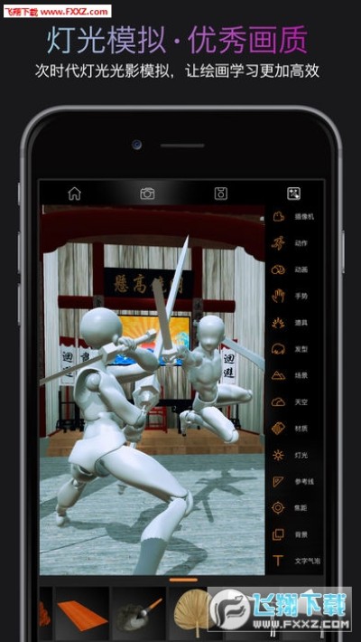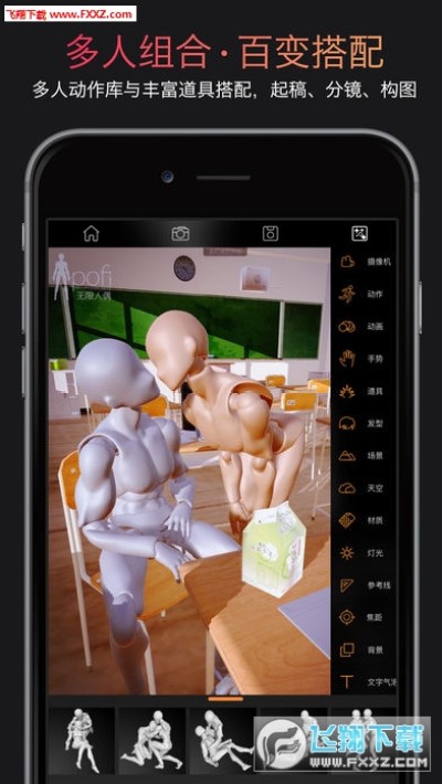 Pofi使用云端下载方式无限制更新绘画资源,包括三维可动人偶、静态虚拟手办、动作库、动画库、手势库、材质灯光库、道具主题包、场景主题包等。通过触屏操作调整人偶,配合资源库快速布景与制定动作,高效完成漫画起稿、动画分镜、电影构图等工作。