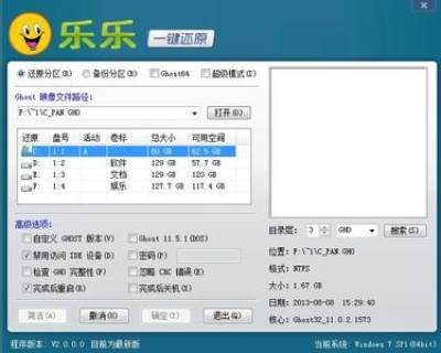 乐乐一键备份还原系统:不用安装即可使用,绿色安全,兼容性强,功能完善。可在Win32(64)、WinPE、DOS 下对任意分区进行一键备份与还原,支持ISO文件、光盘、U盘里的gho文件硬盘安装;支持设定密码保护、自定义热键等功能。