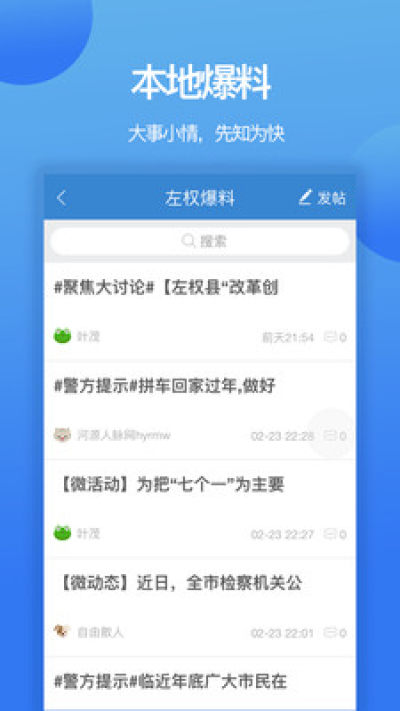 1、本地爆料:关注本城最新的热点信息,仔细核实真实性。第一时间,将信息呈现给您