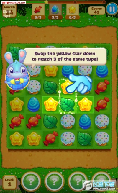 交换,拖动和扫除甜蜜的复活节作品,如复活节彩蛋,巧克力兔子,奶油蛋糕,糖果星和绿色春叶。进行4或5的比赛以制造强大的炸弹和能量提升。并使用魔杖收集单件。你将获得饼干,蛋糕和许多巧克力的奖励!