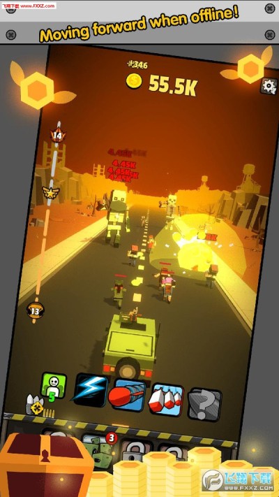 这是一个放置休闲游戏,你需要引导车队尽可能的和僵尸战斗,当你杀死僵尸时你可以获得金币,使用金币来更新武器或者召唤更多的英雄共同奋斗。即使您处于离线状态,您的英雄也会继续和僵尸战斗!