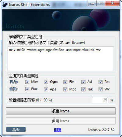 首次使用时,只需简单的点击一下 ‘激活 Icaros’. 它默认能够缩略MKV (10位的也支持) 和OGM 文件.它几乎支持所有的视频文件类型的缩略图,在它可选的视频文件类型中,简单添加一下,然后重新 ‘激活 Icaros’ 即可生效。