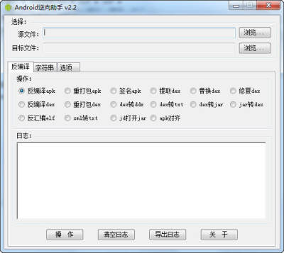 Android 逆向助手是一款针对安卓平台的强大逆向辅助软件,功能涵盖apk反编译打包签名;dex/jar互转替换提取修复;so反编译;xml、txt加密;字符串编码等。支持直接将文件拖放到源和目标文件这,不用每次都点浏览选择。软件暂时支持WinXP、Win7、Win2003系统。