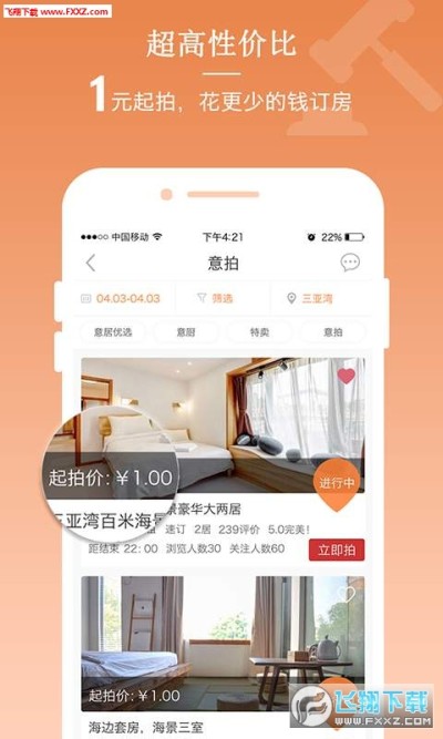 意居App是一款以城乡房产共享经济为主,城市分时租赁、乡村原居原味为亮点的短租平台,不同于传统预定模式,我们将开创以时间可拍卖、参拍可分佣、推广能分成的互联网创新租房模式。时间拍卖新理念,意居租房新体验。