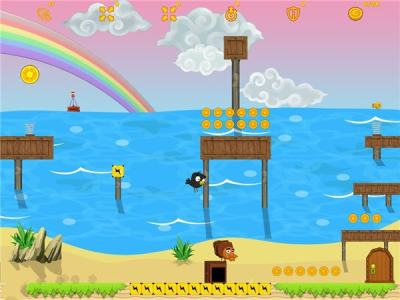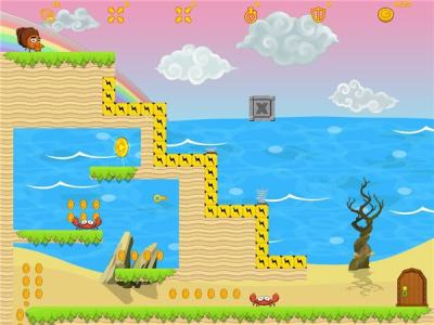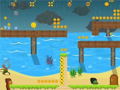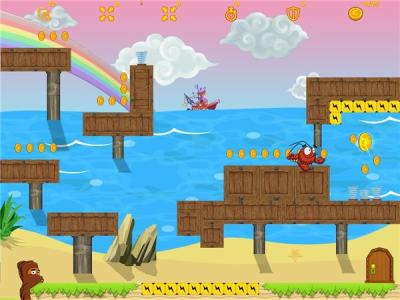 游戏中还为玩家设定了一些角色技能,不过这些技能并不是每一个关卡中都可以使用。可不可使用观察游戏界面上方的一些数字图标,如从左侧数第一个螃蟹的图标旁边的数字代表螃蟹还可以蜕壳几次,第二个图标四个箭头指向中心图标代表可以使用变小技能次数,第三个图标四个箭头向外指向四个方向代表可以使用变大技能的次数,第四个图标为秒表的代表可以使用时间停止技能的次数,第五个图标盾牌为可以使用无敌状态的次数,最后一个图标显示的是你收集金币的数量。