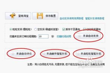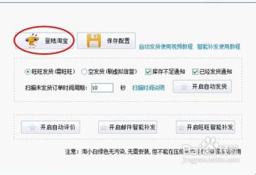 点击登陆淘宝,输入账号信息后,点击登录,关联成功后选择自己希望的需求。如:扫描未发货订单的时间周期,是否自动评价,是否自动发货等,设置完成后,保存设置。