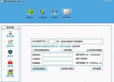 淘小白是一款专门用于淘宝智能发货的软件,免费淘宝自动发货无人值守,真正实现全天无人管理经营网点。本软件能让虚拟卖家开店更轻松,集成旺旺,邮件,网页自动发送卡密 等等。