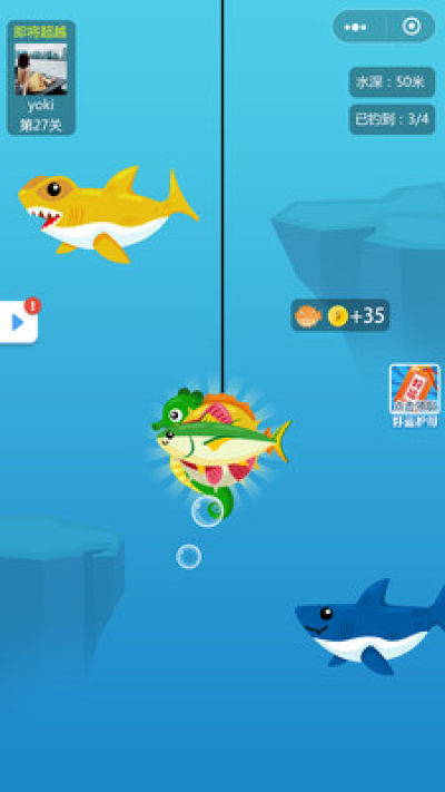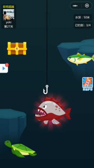 在游戏中,玩家点击屏幕投掷鱼钩,可以从水下钓起各色鱼种。钓出的鱼儿数量越多,鱼种约稀有,则获取的金币奖励越多。玩家可以升级鱼钩、鱼线,从而提高钓鱼的数量和稀有度,从而获得更高的收入。