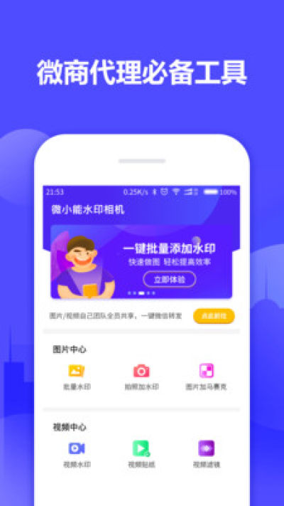 微小能水印相机是针对微商进行朋友圈营销,优化图片视频和团队素材下发的工具,是微商代理必备的工具APP。
